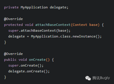 將控制權交回給 MyApplication,我們最初是代理 MyApplication 的生命周期。具體做法是,MoaiApplication 決定加載哪裡的業務代碼、資源文件以及 so 文件之後依然負責接收 App 的全部生命周期,然後把生命周期代理給 MyApplication,簡單例子如下: