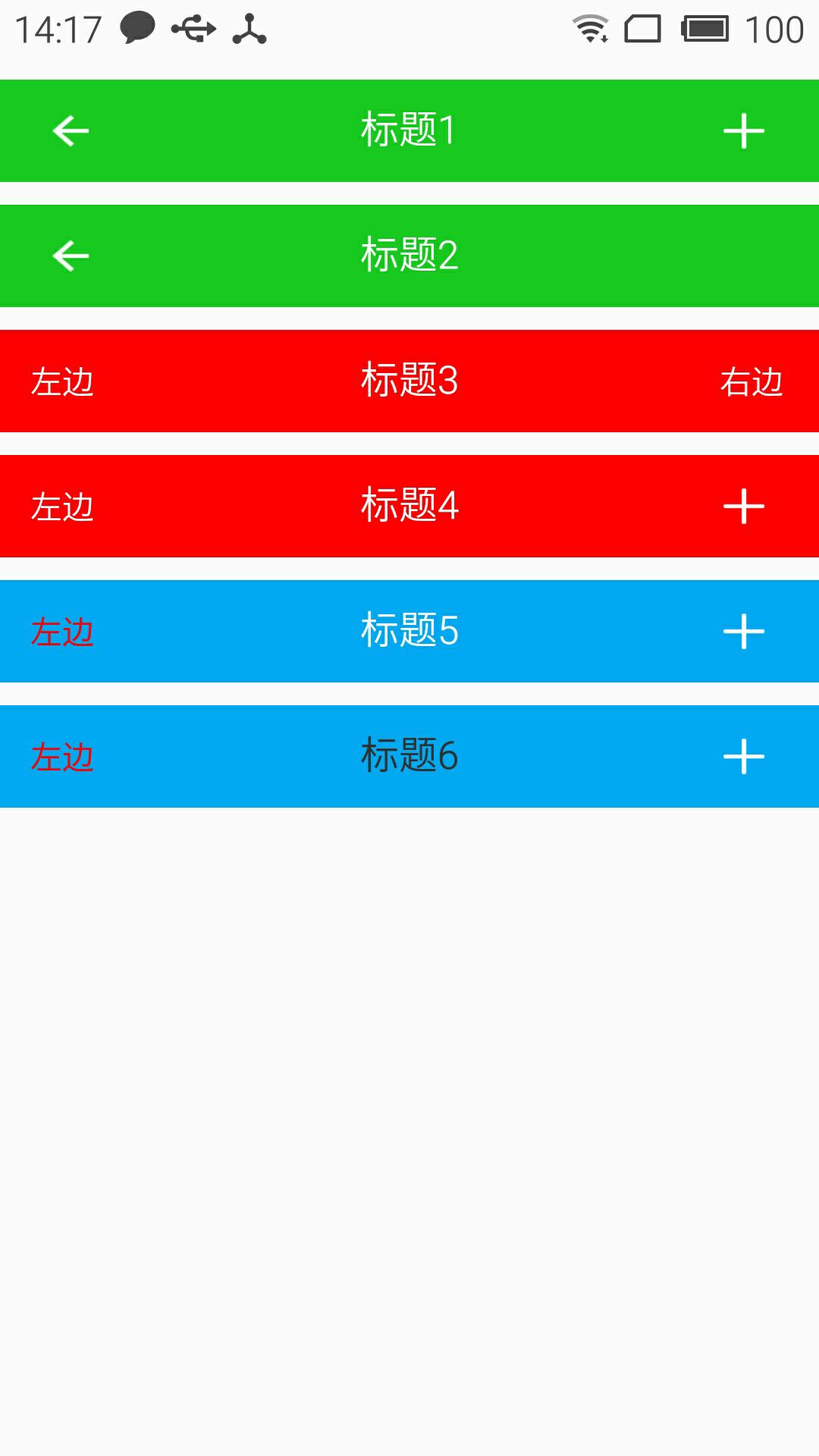 關於如何使用自定義屬性這裡就不再說明了,為了更加直觀的查看效果,我這裡在一個布局文件中實現不同要求的標題欄