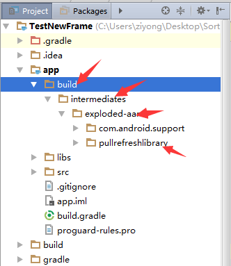 5.編譯完成後,在app/build/intermediates/exploded-aar/ a就可以看見我們引用的aar包內容了,其中jar目錄下是jar文件,res下是我們aar包裡的資源文件。