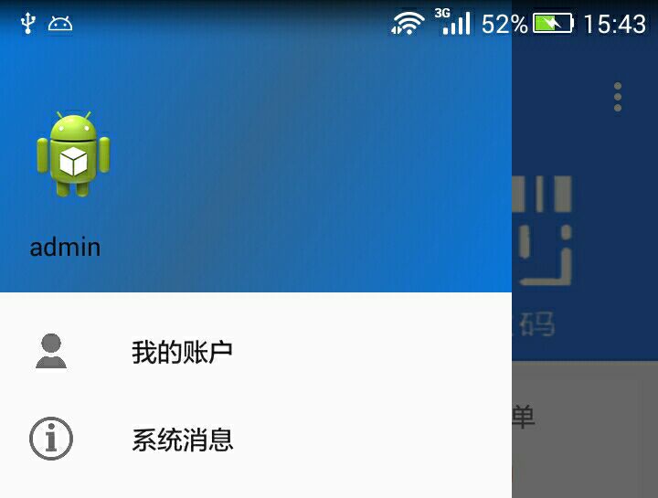 運行了一下效果,嗯,還不錯,但當你如果用的是這個方法添加的view作狀態欄背景色的話,其實有一個坑,不過我貼的代碼上已經解釋了這個坑的處理方法了。這個坑其實就是和DrawerLayout配合使用的時候,當你打開抽屜的時候,會看到側滑菜單在狀態欄的下面,如圖所示:
