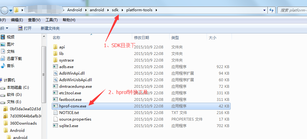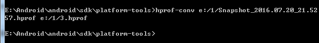 將Snapshot_2016.07.20_21.52.57.hprof文件拷貝至e:/1/文件夾下,cmd到hprof-conv.exe目錄下並執行轉換命令,如下: