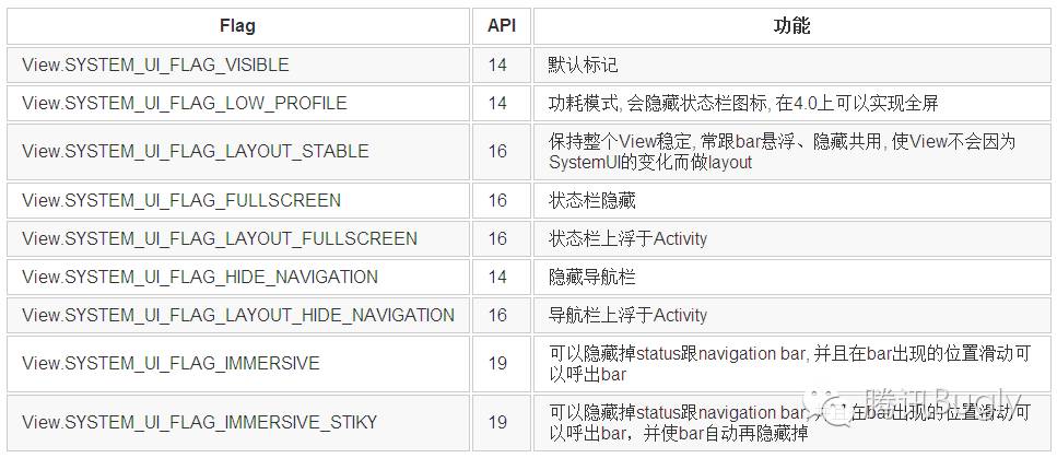 一般來說,沉浸模式的標記與其他Full Screen相關的Flag搭配起來才能達到我們想要的效果,即通過沉浸模式標記規定狀態欄status bar和導航欄navigation bar顯示和隱藏的運轉邏輯,通過其他標簽設定狀態欄和導航欄顯示或隱藏,以及顯示或隱藏的樣子。這些常見的Flag及相應功能如下表: