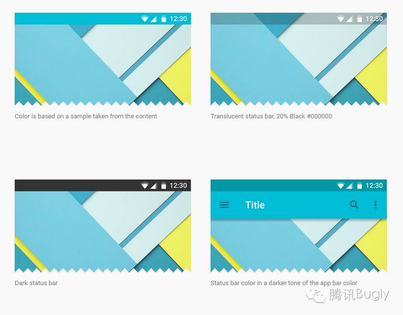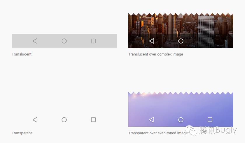 在 Android 5.0 之後引入了 Material Design,狀態欄和導航欄也玩出了更多花樣。現在除了原有的“半透明”模式以外,還有“全透明”以及“變色”模式,一種會完全隱藏背景,另一種可以取色作為背景顏色,多種樣式的透明欄如下圖(上圖為透明狀態欄,下圖為透明導航欄):