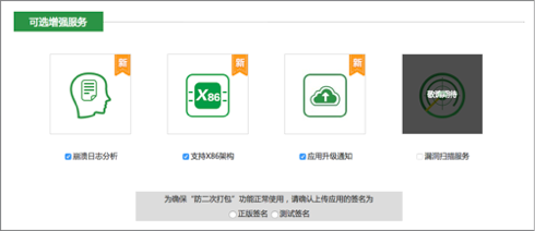 360的加固流程大體和阿裡聚安全差不多,加固前選擇項比較多,可以選擇增強服務比如日志分析,X86架構,應用升級通知,對於簽名的選擇。