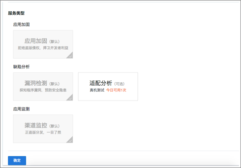 騰訊雲的加固上傳應用後默認選擇了加固,漏洞檢測還有渠道監控。可選項是適配分析,限量每天一次。