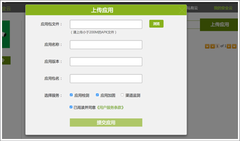 通付盾加固的界面,選擇應用上傳後,選擇服務點擊提交便可。