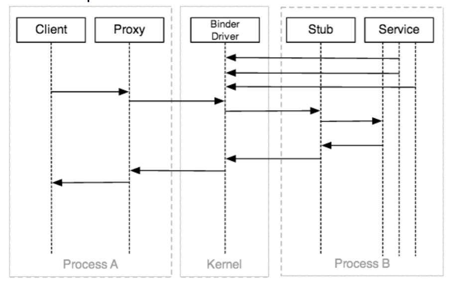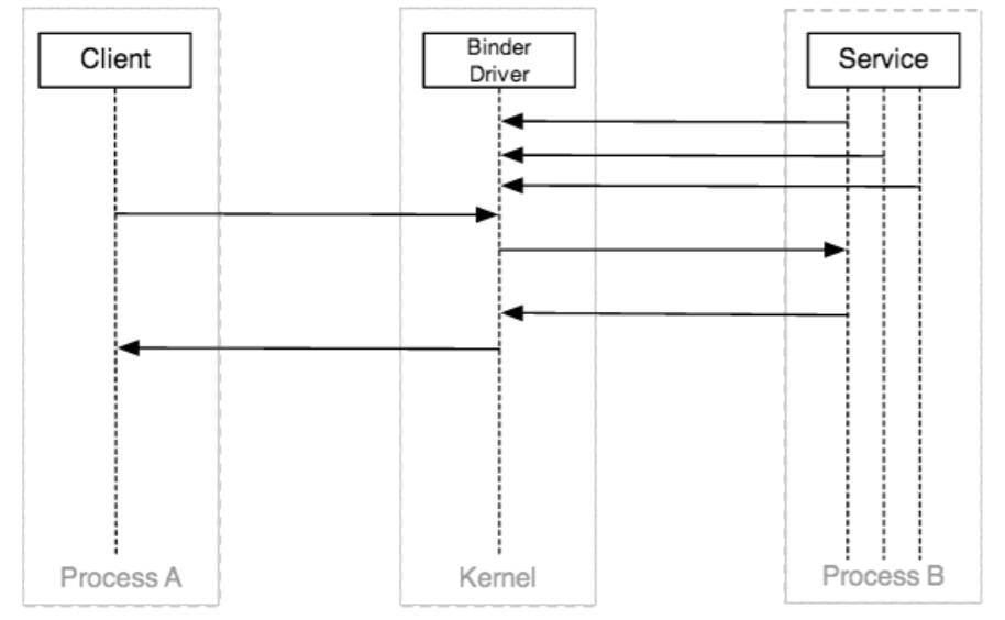 但是由於進程的隔離性,Client所在的ProcessA是不能讀寫Service所在的ProcessB中的內容,但系統內核可以,而Binder驅動就是運行在內核態。Binder驅動幫我們中轉請求即可: