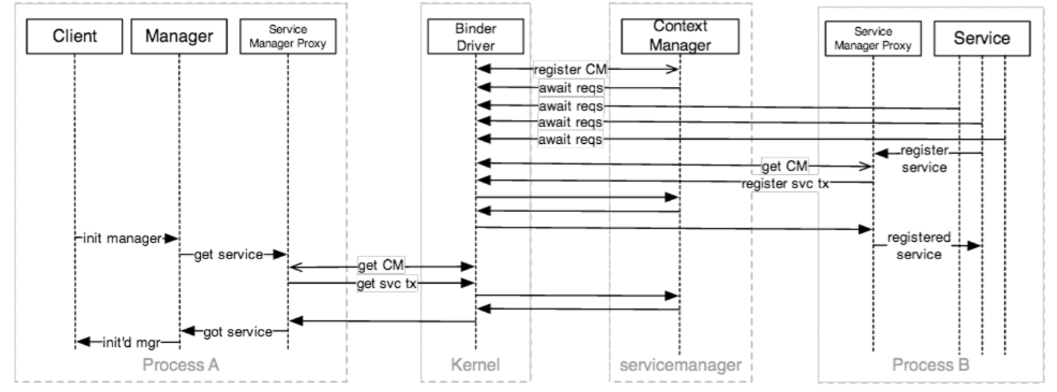 如上圖所示,假設Service所在的進程ProcessB在servicemanager進程啟動後啟動,ProcessB需要向servicemanager注冊。“注冊”這個動作,本質也是要跨進程通信,從ProcessB到servicemanager,這時,Service成為了本次跨進程通信的客戶端,ContextManager成為了服務端。客戶端到服務端的通信,按前面講到的內容,需要一個Proxy或者Manager。這個Proxy或者Manager從哪裡獲取呢?問題好像陷入了循環死鎖?因為ContextManager的特殊地位,讀者可以理解為系統對它有點特殊待遇,Service可以從一個全局固定的地方直接去拿Proxy或者Manager,而不用像Client那樣通過查詢來獲取Proxy/Manager。拿到了客戶端代理,具體注冊的通信過程如上文所講,不再重復。到這裡為止,Service就成功注冊到了ContextManager中。
