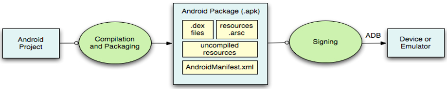 Android程序編譯完之後生成.class文件,然後,dex工具會把.class文件處理成.dex文件,然後把資源文件和.dex文件等打包成.apk文件,apk就是android package的意思。