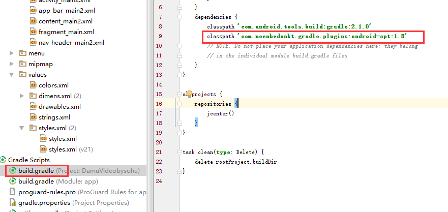 27 classpath 'com.neenbedankt.gradle.plugins:android-apt:1.8'