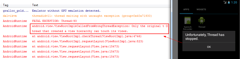 在android中,線程可以分為MainThread(UI線程)和WorkerThread(除了MainThread之外的線程)。從原則上來說,在UI線程之外是禁止修改UI的,如以下這個例子,創建一個線程,休眠3秒後設置textView顯示文本內容,點擊button時觸發監聽器生成線程對象。