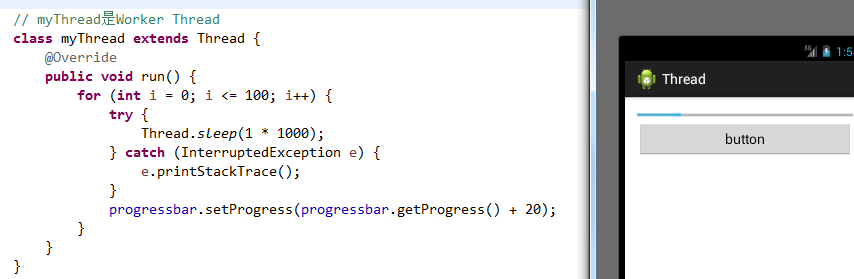 大部分情況下,View在MainThread中創建出來的,對View的訪問需要在MainThread中完成。但也有一部分控件例外,如ProgressBar,點擊button線程休眠1秒後進度條每次增加20