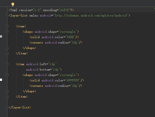 (5)<item android:left="1dp" android:bottm="1dp">就是控制上層形狀偏移,其實這不太像偏移,因為從AS的預覽效果來看,它沒有移動的感覺,而是減掉了1dp的長度。當然這預覽效果也有點怪,在<item>裡寫一個屬性時,能正常預覽,但寫多一個就完全變形了。