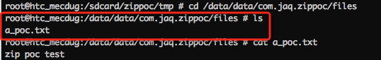 此ZIP文件存放在SD卡中,想讓解壓出來的所有文件也存在SD卡中,但是a_poc.txt文件卻存在了應用的數據目錄中: