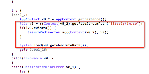 應用使用的是System.load()來加載libdolphin.so而非System.loadLibrary(),在Android中,System.loadLibrary()是從應用的lib目錄中加載.so文件,而System.load()是用某個.so文件的絕對路徑加載,這個.so文件可以不在應用的lib目錄中,可以在SD卡中,或者在應用的files目錄中,只要應用有讀的權限目錄中即可。