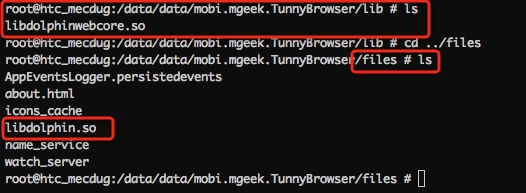 2、動態鏈接庫文件libdolphin.so,並沒有放在應用數據的lib目錄下,而是放在了files目錄中: