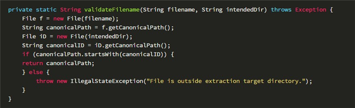 其檢查方式是利用File類提供的getCanonicalPath()方法濾掉zipEntry.getName()返回的字符串中所包含的“../”,然後檢查這個字符串是否是以要解壓到的目標目錄字符串為開頭,如果是返回getCanonicalPath()獲取到的字符串,如果不是,則拋出異常: