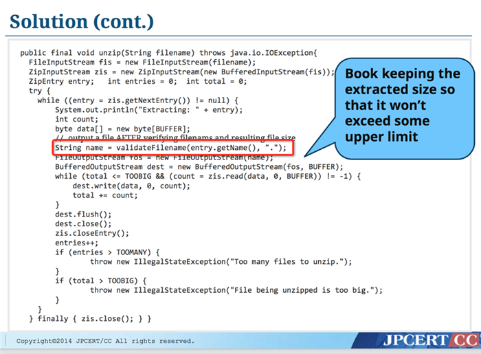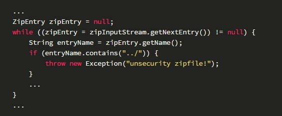 也可以使用java.util.zip包中的ZipFile類,直接讀取Zip包中的所有entries,然後檢查getName()的返回值是否包含“../”: