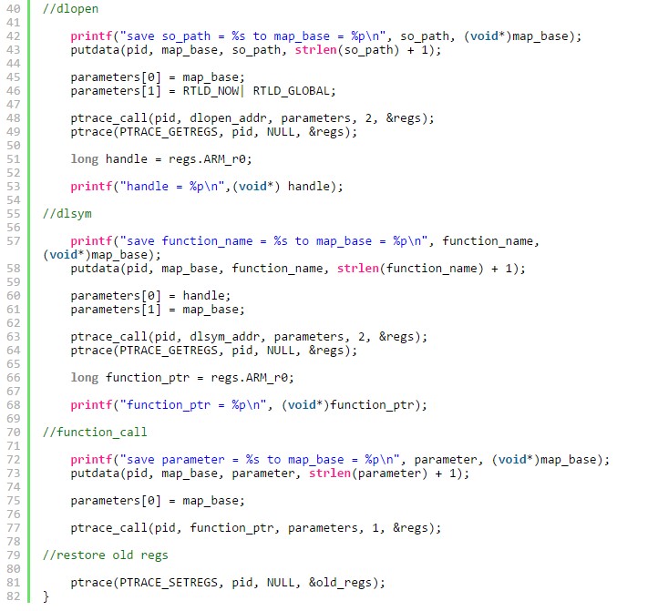 保存當前寄存器的狀態 -> 獲取目標程序的mmap, dlopen, dlsym, dlclose 地址 -> 調用mmap分配一段內存空間用來保存參數信息 –> 調用dlopen加載so文件 -> 調用dlsym找到目標函數地址 -> 使用ptrace_call執行目標函數 -> 恢復寄存器的狀態