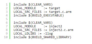 為了讓大家更容易的理解hook的原理,我們先只考慮arm指令集,因為arm相比thumb要簡單一點,不需要考慮指令長度的問題。所以我們需要將target和hook的so編譯成arm指令集的形式。怎麼做呢?很簡單,只要在Android.mk中的文件名後面加上”.arm”即可 (真正的文件不用加)。