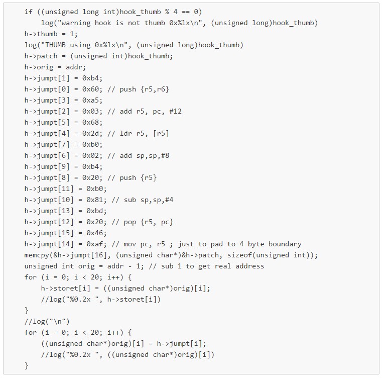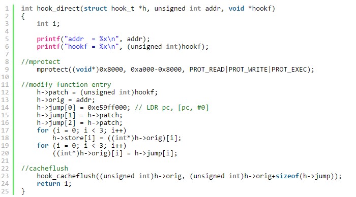 接下來我們看如何修改函數入口(modify function entry),首先我們保存一下原函數的地址和那個函數的前三條指令。隨後我們把目標函數的第一條指令修改為 LDR pc, [pc, #0],這條指令的意思是跳轉到PC指針所指的地址,由於pc寄存器讀出的值實際上是當前指令地址加8,所以我們把後面兩處指令都保存為hook函數的地址,這樣的話,我們就能控制PC跳轉到hook函數的地址了。