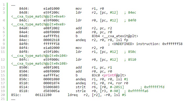 雖然target這個binary被strip了,但還是可以找到sevenWeapons()這個函數的起始地址是在0x84f4。因為”mov r2, r0”就是加載number這個參數的指令,隨後調用了<printf@plt>用來輸出結果。 最後一個參數也就是我們要執行的hook函數的地址。得到這個地址非常簡單,因為是so中的函數,調用hook_direct()的時候直接寫上函數名即可。