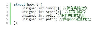 確定了指令集以後,我們來看實現掛鉤最重要的邏輯,這個邏輯是在注入後的so裡實現的。首先我們需要一個結構體保存匯編代碼和hook地址: