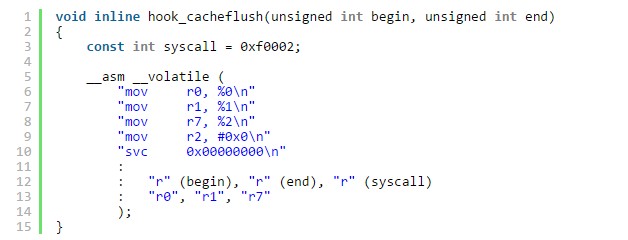 最後我們再調用hook_cacheflush()這個函數來刷新一下指令的緩存。因為雖然前面的操作修改了內存中的指令,但有可能被修改的指令已經被緩存起來了,再執行的話,CPU可能會優先執行緩存中的指令,使得修改的指令得不到執行。所以我們需要使用一個隱藏的系統調用來刷新一下緩存。hook_cacheflush()代碼如下: