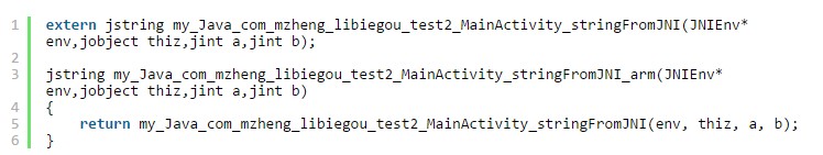 點擊程序中的button後,程序會調用so中的Java_com_mzheng_libiegou_test2_MainActivity_stringFromJNI(JNIEnv* env,jobject thiz,jint a,jint b)函數用來計算a+b的結果。我們默認傳的參數是a=1, b=1。接下來我就來教你如何利用adbi來hook這個JNI函數。