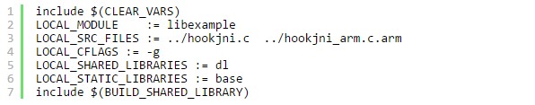這個文件的目的僅僅是為了用arm指令集進行編譯,可以看到Android.mk中在”hookjni_arm.c”後面多了個”.arm”: