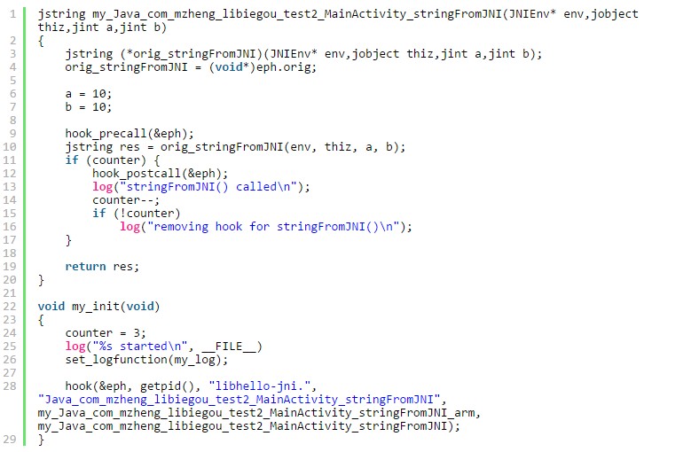 my_Java_com_mzheng_libiegou_test2_MainActivity_stringFromJNI()就是我們提供的hook函數了。我們在這個hook函數中把a和b都改成了10。除此之外,我們還使用counter這個全局變量來控制hook的次數,這裡我們把counter設置為3,當hook了3次以後,就不再進行hook操作了。