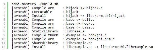編輯好代碼後,我們只需要在adbi的根目錄下執行” build.sh”進行編譯: