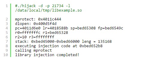 編譯好後,我們把hijack和libexample.so拷貝到/data/local/tmp目錄下。然後使用hijack進行注入: