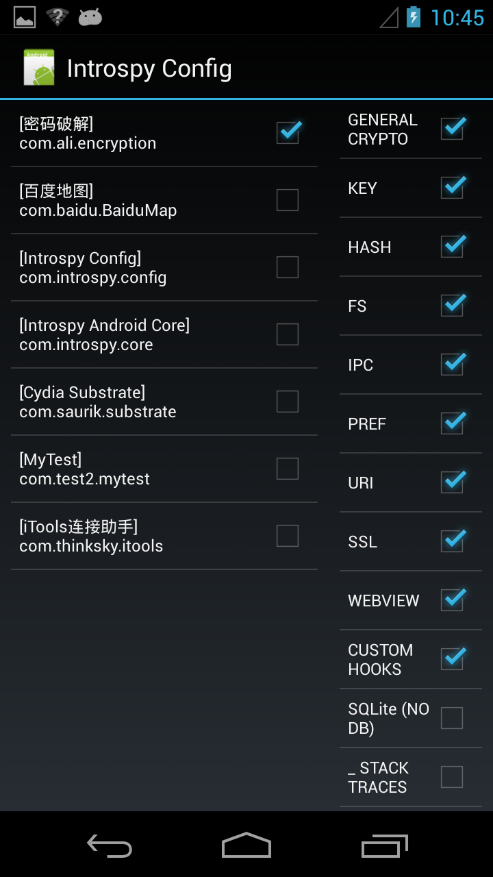 然後我們編譯,生成並安裝Introspy-Android Core.apk到手機上。然後我們安裝上EvilApk400。然後打開Introspy-Android Config勾選com.ali.encryption。