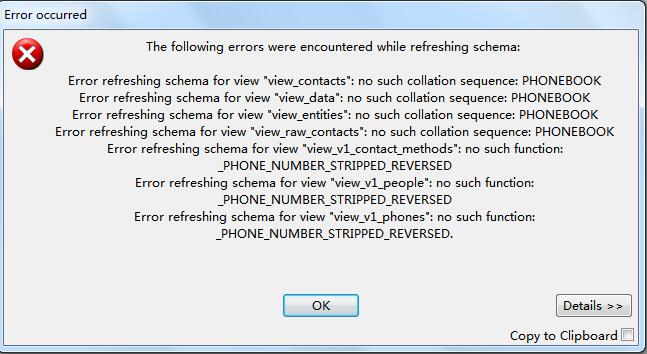 將contacts2.db文件導出,添加到sqlite中的時候報錯: