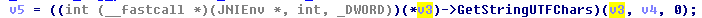 首先是一個指針加上一個數字,比如v3+676。然後將這個地址作為一個方法指針進行方法調用,並且第一個參數就是指針自己,比如(v3+676)(v3…)。這實際上就是我們在JNI裡經常用到的JNIEnv方法。因為Ida並不會自動的對這些方法進行識別,所以當我們對so文件進行調試的時候經常會見到卻搞不清楚這個函數究竟在干什麼,因為這個函數實在是太抽象了。解決方法非常簡單,只需要對JNIEnv指針做一個類型轉換即可。比如說上面提到v3指針,我們選中後按一下”y”鍵,然後將類型聲明為”JNIEnv*”。
