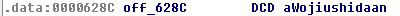 於是我們查看off_628c這個地址對應的指針,發現對應的字符串是”wojiushidaan”。