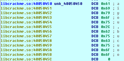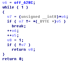 我們的目標就是獲取到密碼。使用ida反編譯一下so文件會看到我們輸入後的密碼會和off_628c這個指針指向的字符串進行比較。