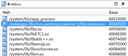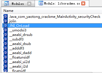 隨後程序會在加載libcrackme.so這個so文件的時候停住。這時候ida會出現找不到文件的提示,不用管他,點取消即可。隨後就能在modules中看到libcrackme.so這個so文件了,我們點進去,然後在JNI_OnLoad處下個斷點,然後點擊執行,程序就進入了JNI_OnLoad()這個函數。