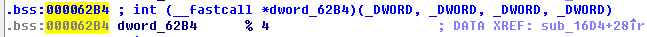 有意思的是在靜態分析中我們並不清楚dword_62B4這個函數是做什麼的,因為這個函數的地址在.bss段還沒有被初始化: