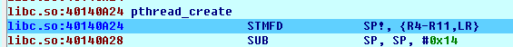 但是當我們動態調試的時候,這個地址的值已經修改為了phread_create()這個函數的地址了。:
