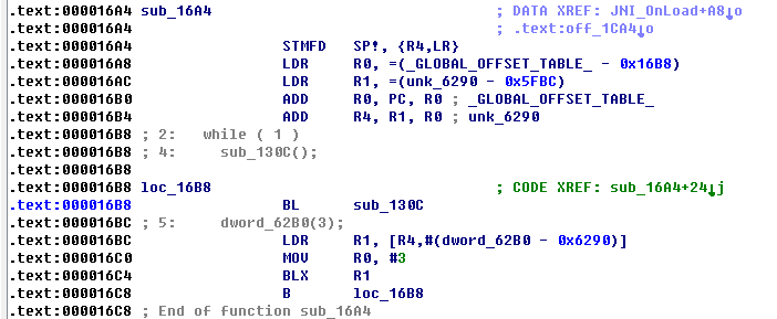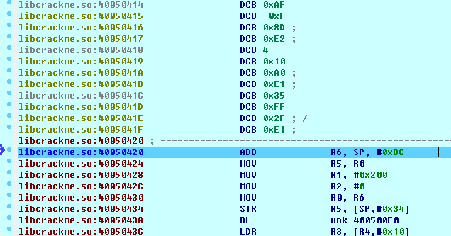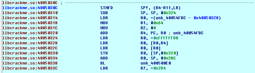 解決辦法還是ida雙開,我們知道現在PC的地址為40050420,libcrackme.so文件的基址為4004F000。因此這段代碼在so中的位置應該是:40050420 - 4004F000 = 1420。因此我們回到ida靜態分析界面,就可以定位到我們其實是在sub_130C()這個函數中。於是我們猜測這個函數就是用來做反調試檢測的。