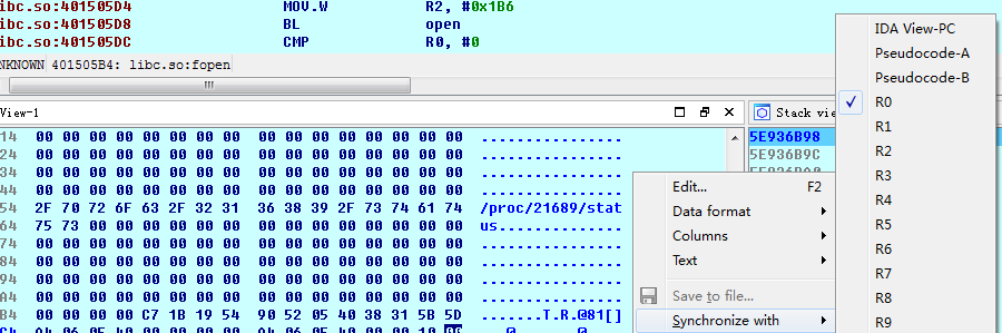 所以說自毀程序密碼這個app會用pthread_create()開一個新的線程對app進行反調試檢測。線程會運行sub_16A4()這個函數。於是我們對這個函數進行分析,發現裡面的內容有大量的混淆,看起來十分吃力。這裡我介紹個小trick:常見的反調試方法都會用fopen打開一些文件來檢測自己的進程是否被attach,比如說status這個文件中的tracerpid的值是否為0,如果為0說明沒有別的進程在調試這個進程,如果不為0說明有程序在調試。所以我們可以守株待兔,在libc.so中的fopen()處下一個斷點,然後我們在hex view窗口中設置數據與R0的值同步: