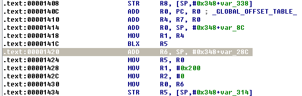 因此我們可以通過基址來定位sub_130C()這個函數在內存中的地址:40050420 + 130C = 4005030C。然後我們在4005030C這個地址處按”P”, ida就可以正確的識別整個函數了。