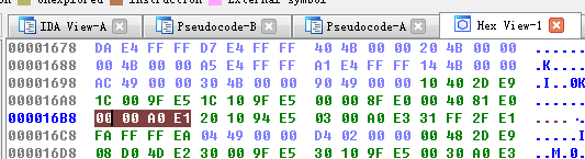 因為ARM是沒有單獨的NOP指令的。於是我們采用movs r0,r0作為NOP。對應的機器碼為”00 00 A0 E1”。所以我們把”13 FF FF EB”這段內容修改為”00 00 A0 E1”。
