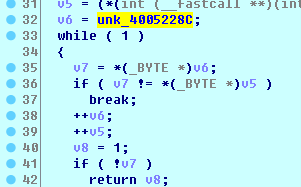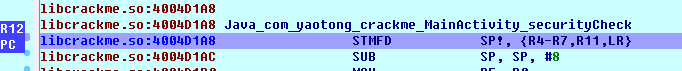 程序就會暫停在”Java_com_yaotong_crackme_MainActivity_securityCheck”處。我們先按”P”再按”F5”,就可以看到反匯編的c語言了。而這裡的unk_4005228C就是保存了密碼字符串指針的指針。