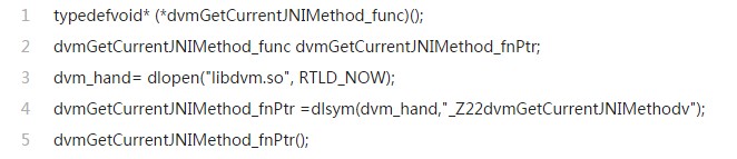 另外我們還可以自己創建一個NDK項目,然後自己編寫一個so或者elf利用dlopen()和dlsym()調用目標so中的函數。比如我們想要調用libdvm.so中的dvmGetCurrentJNIMethod()函數,我們就可以在我們的NDK項目中這麼寫: