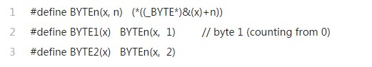 有時我們想要將app中的某個函數的邏輯提取出來,用gcc重新編譯一個可執行文件,比如我們想要寫一個注冊機,就需要把app生成key的邏輯提取出來。但是ida ”F5”過後的c語言直接編譯經常會有很多錯誤,比如未定義的宏,未定義的聲明等。這是因為這些宏都在ida的一個頭文件裡。裡面定義了所有ida自定義的宏和聲明,比如說經常見到的BYTEn()宏: