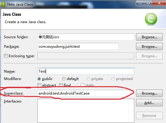 新建android項目,新建Test.java文件,注意定義一個類繼承一定要繼承AndroidTestCase