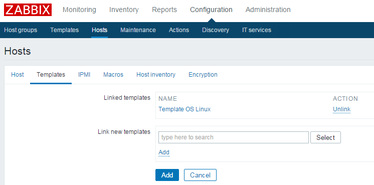 “Link new templates”,Selectà選定Template OSLinux模板àAdd確認添加模板,會在“Linked Templates”處呈現添加的模板;